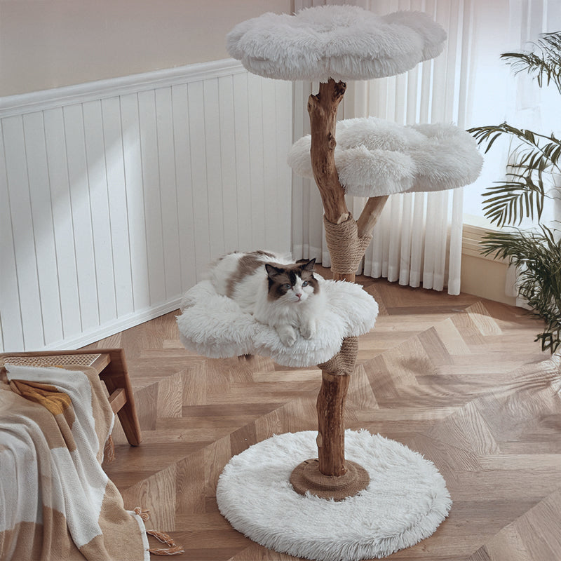 天然の果木を使用した支柱と土台。ナチュラルで温もりのある風合いに、爪とぎにも最適なサイザル麻を組み合わせ。