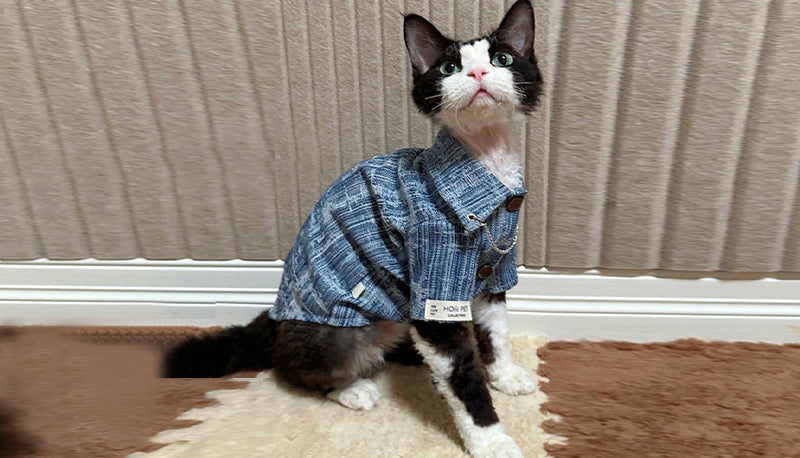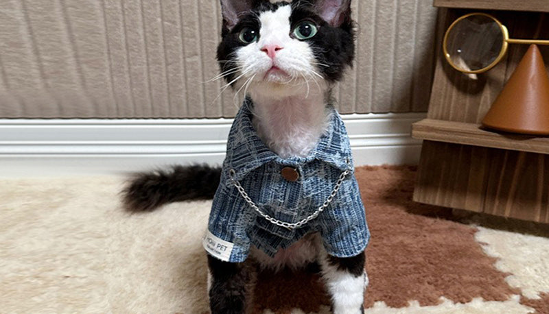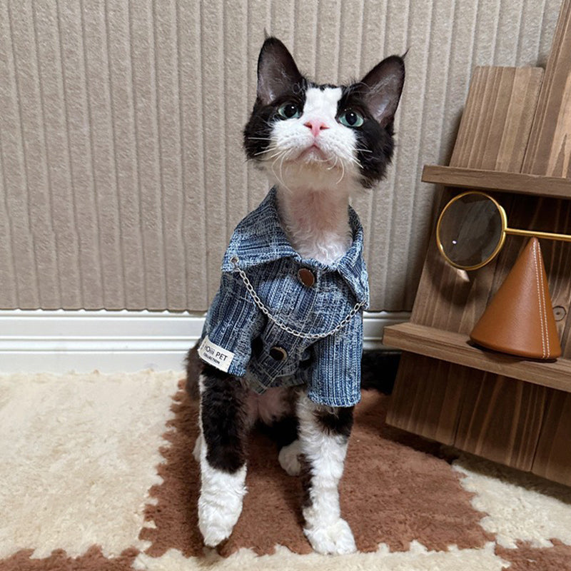 この犬服・猫服は、デニム調のデザインにチェーンアクセントを加えた、都会的でおしゃれな一着です。見た目のスタイリッシュさだけでなく、快適な着心地も実現しました。