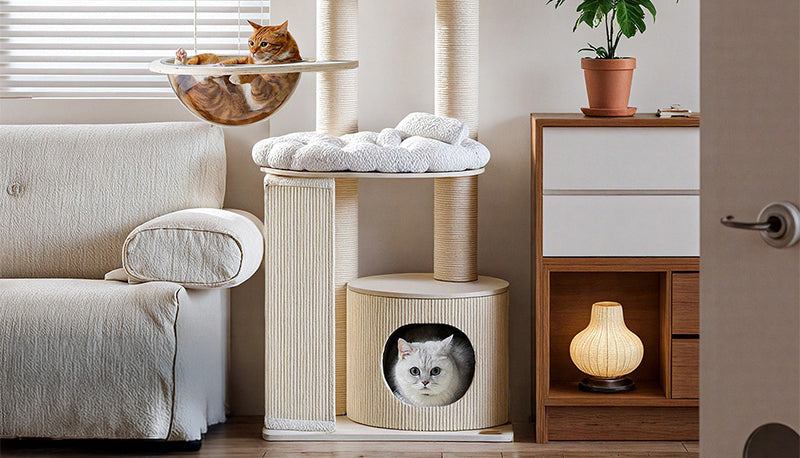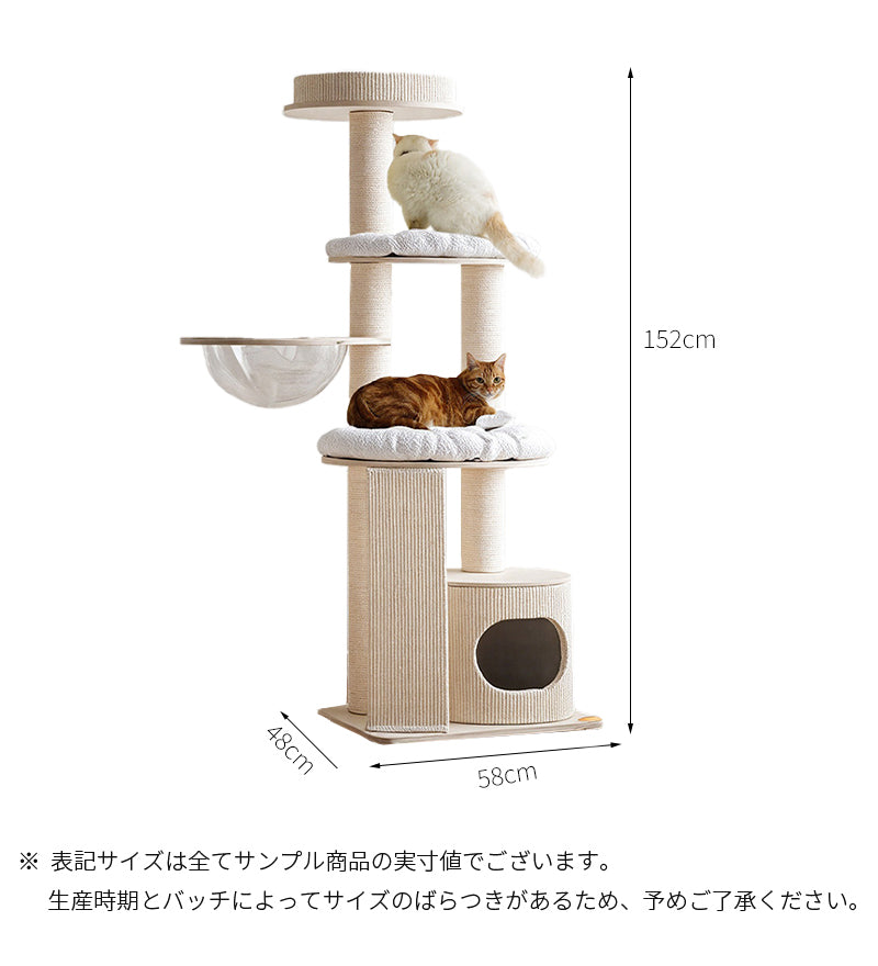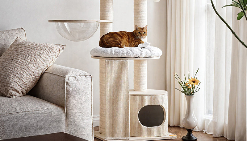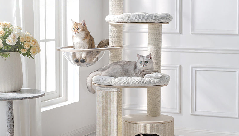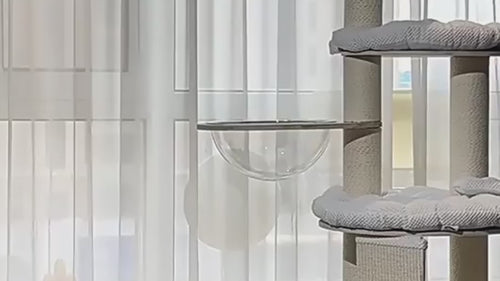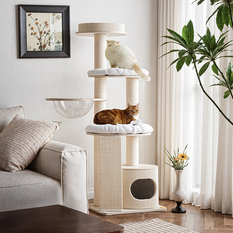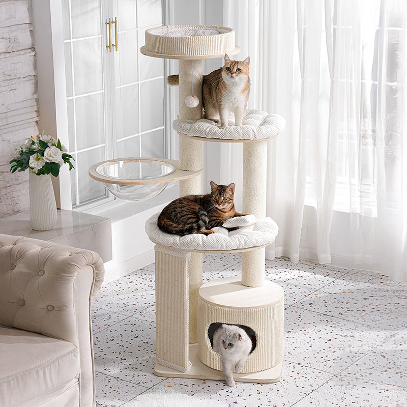 透明なプラスチック製のバスケット、ふかふかのベルベットクッション、そしてしっかりした爪とぎポールを配置。登る・休む・遊ぶ・隠れるという猫の行動をすべて満たしながら、耐荷重30kgで多頭飼いにも安心して使える堅牢な設計になっています。