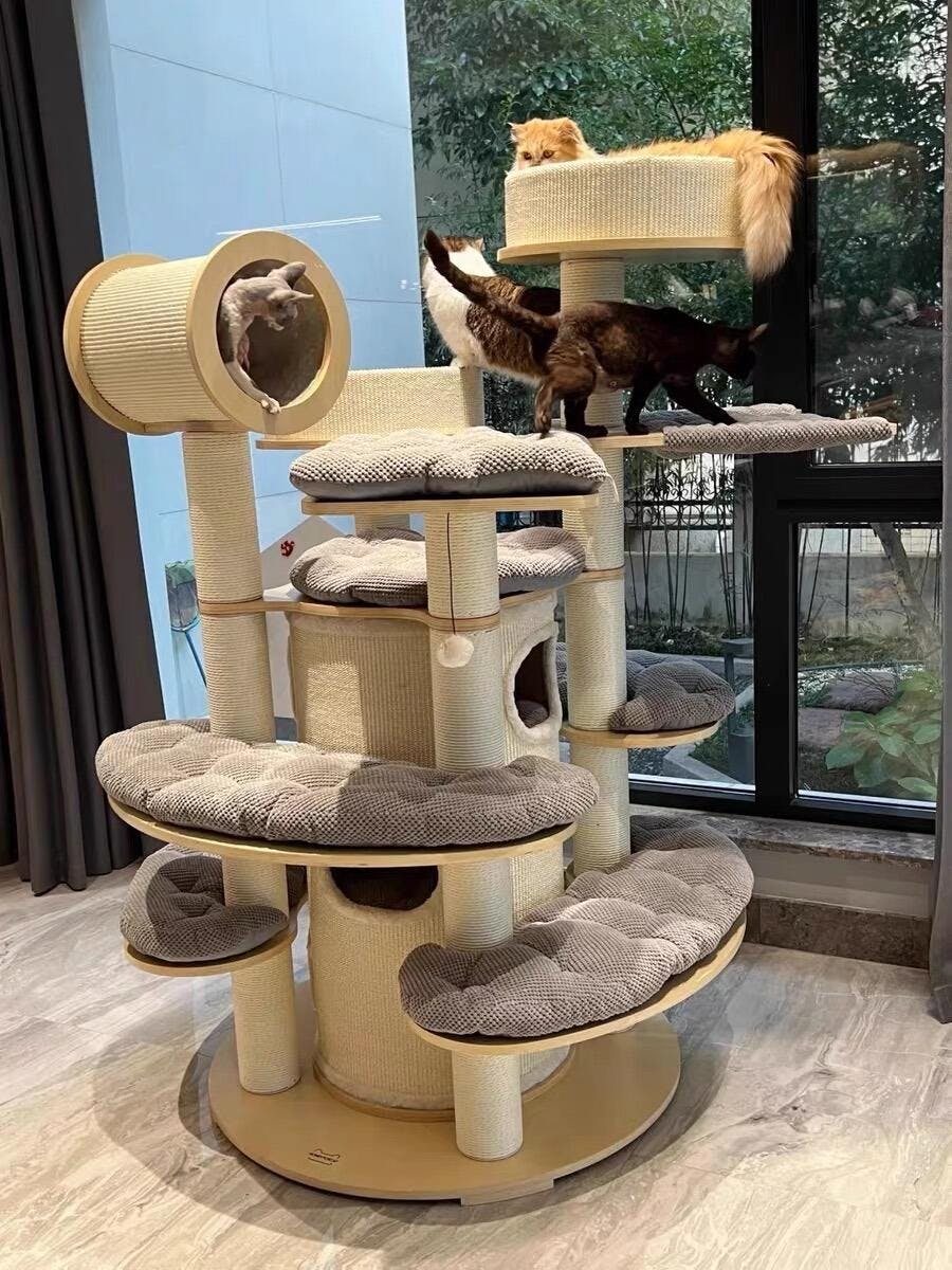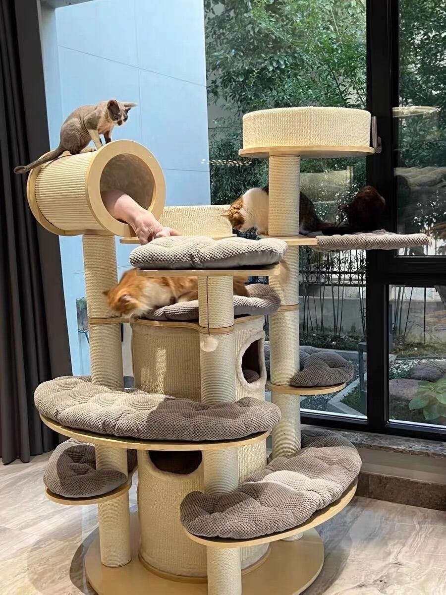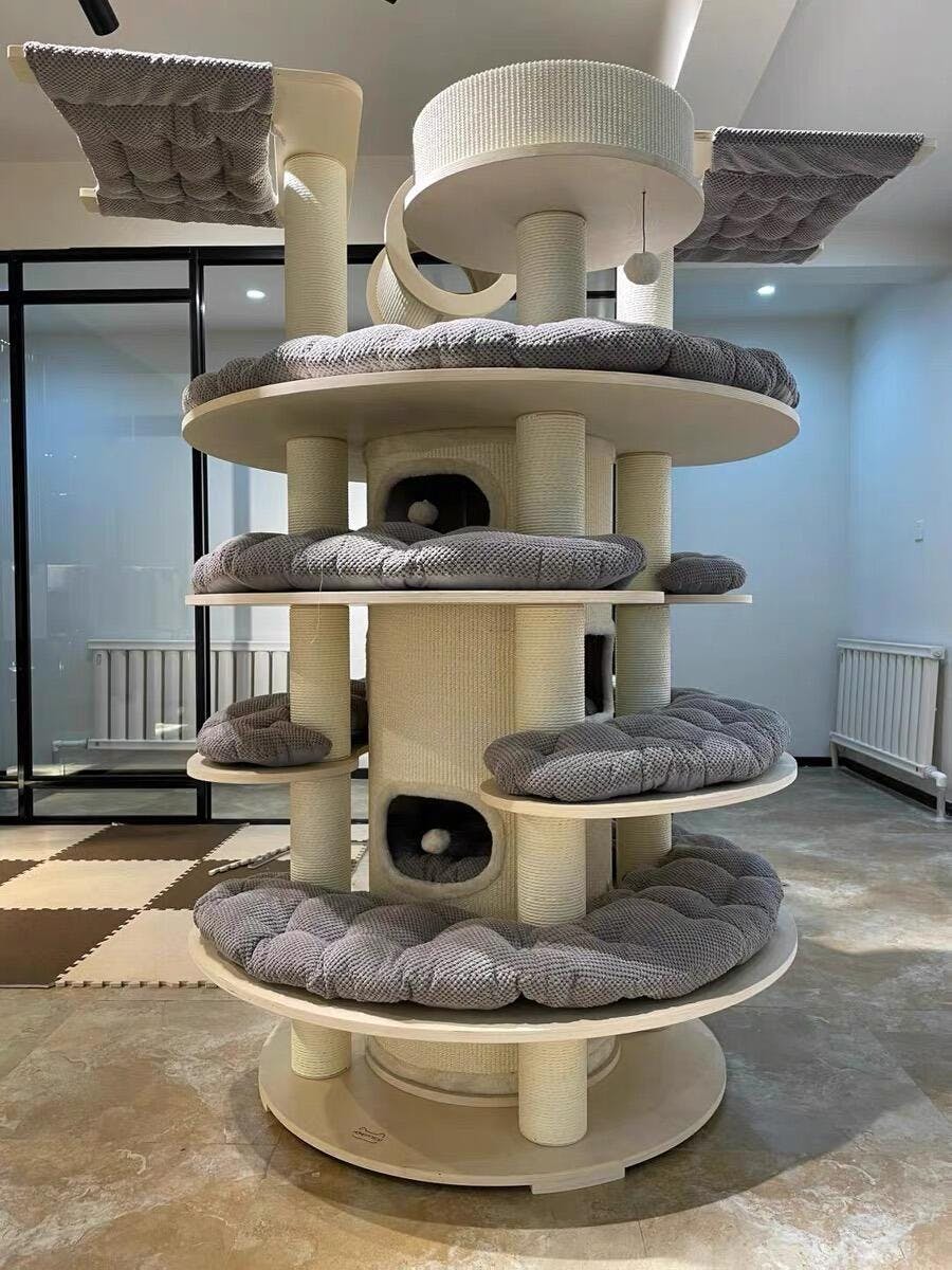 広めのベッドやドーム型の隠れ家、ふかふかのクッション、爪とぎ可能なポールなど、細部にまでこだわった仕上がり。