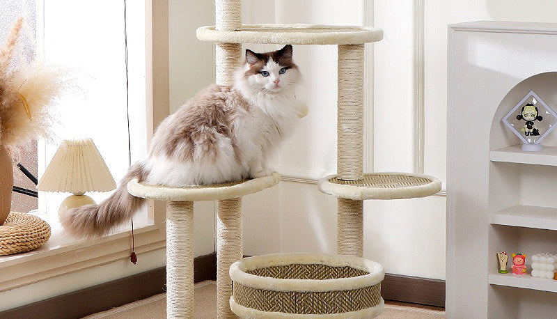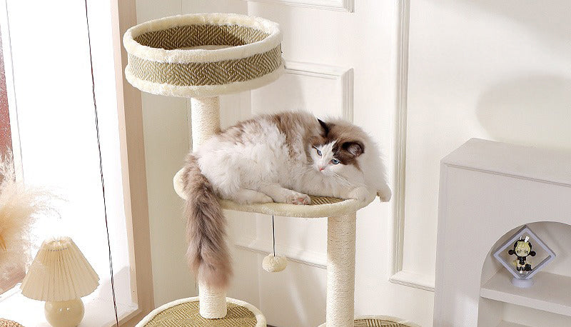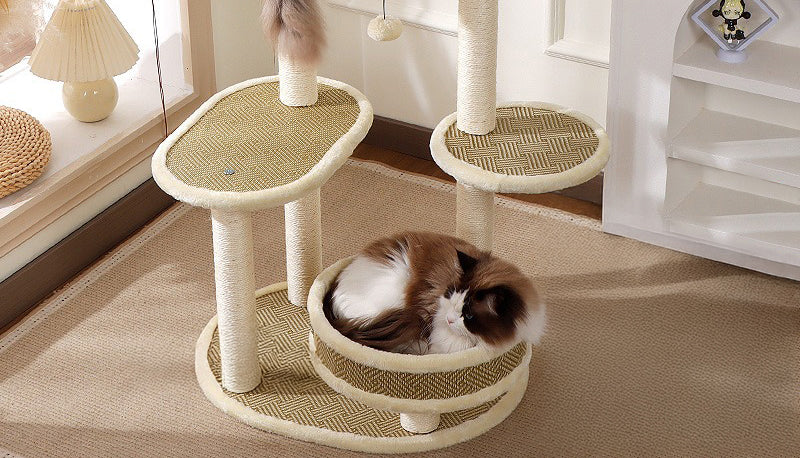 柱には天然ホワイトのサイザルロープを巻き、各プラットフォームにはラタン編みマットを敷きソフトなボアで縁取り。
