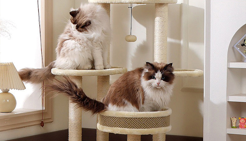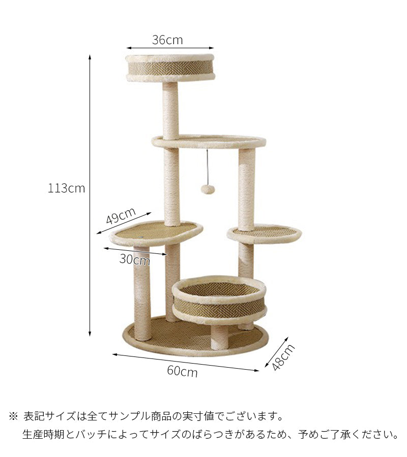 囲み型の見晴らしベッドや段差のあるマルチステップ、ラタンの小さな踏み台に加え、弾力ポンポンと全柱爪とぎエリアで遊びと運動を分散し、家具へのキズも抑えます。