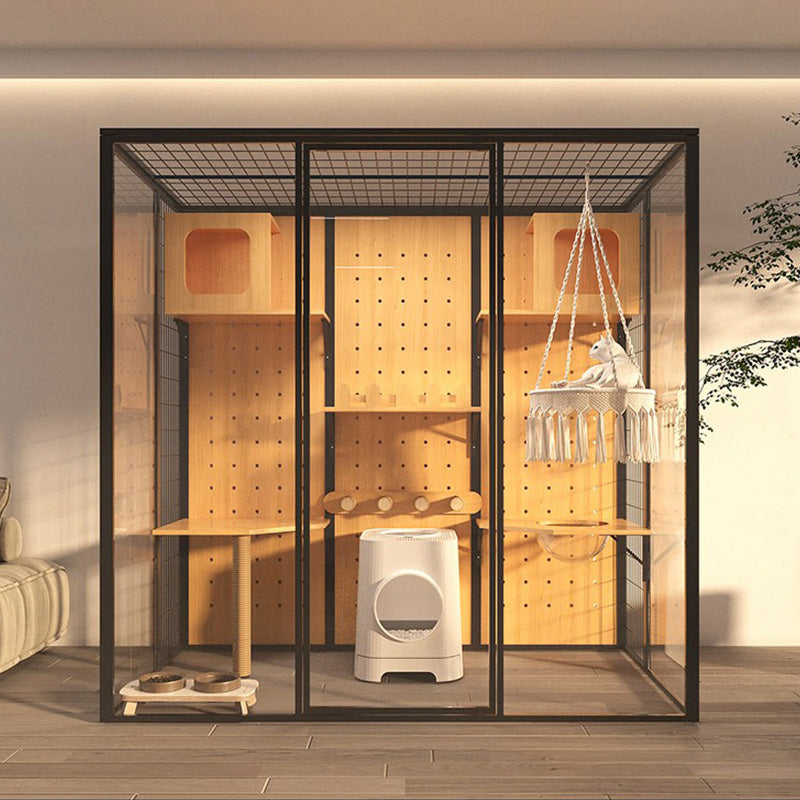 透明な四面パネルは360度の視認性を確保し、どこからでも猫の様子を見守ることができます。通気設計と段差構造が、登る・隠れる・遊ぶ・休むといった行動を自然に誘導します。