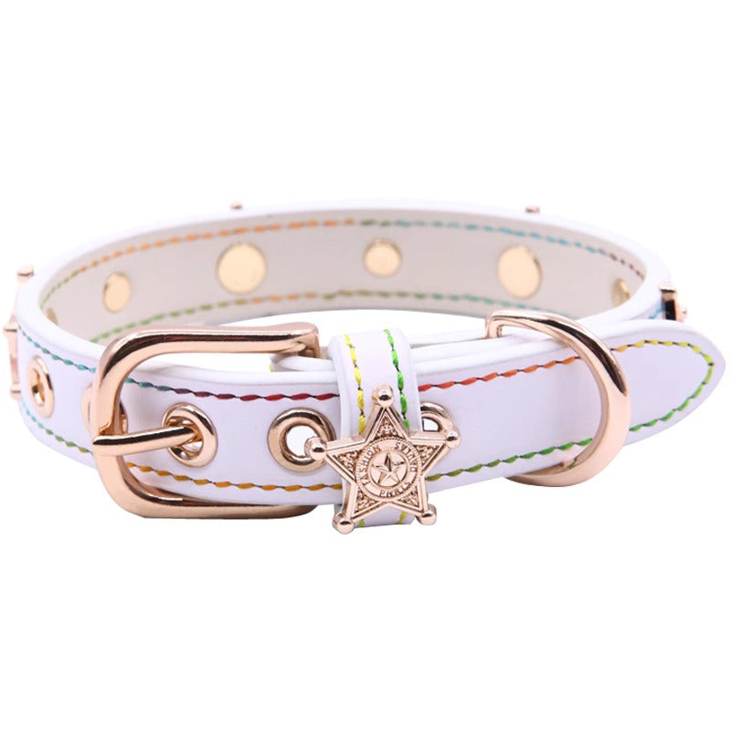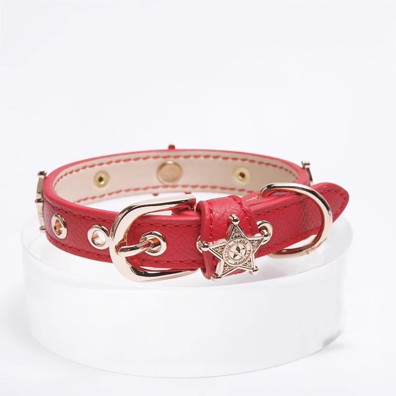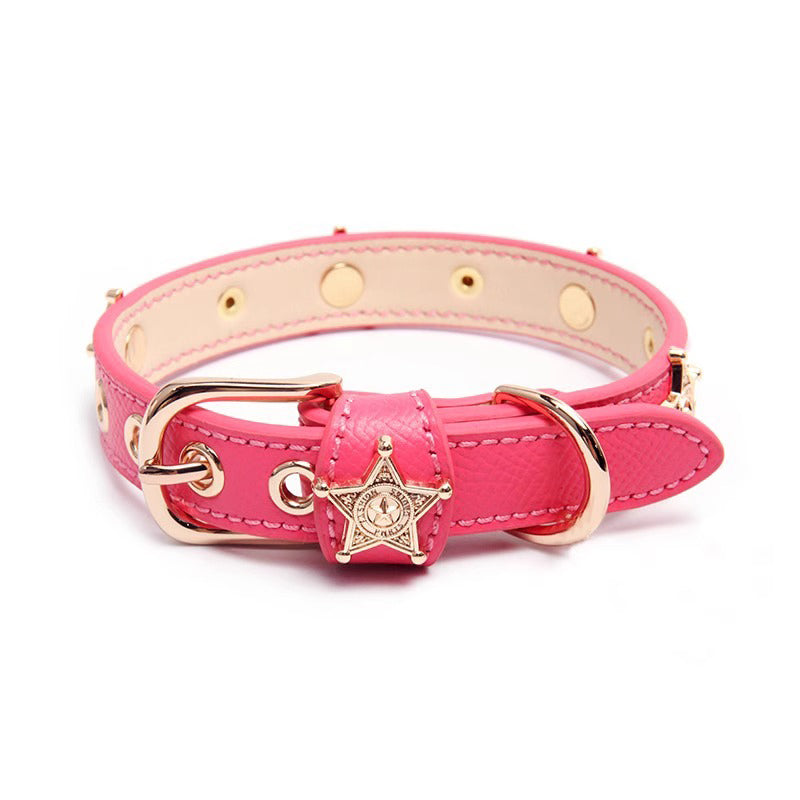 牛革に丁寧なステッチを施し、星型メタルとアクリルスタッズを散りばめた首輪。金属&ローラーバックルで着脱スムーズ、Dリングでリード連結も簡単。軽量設計でで、複数の調整穴で愛犬・愛猫に心地よくフィットします。カラーは、ピンク、ホワイト、ブラックなど多色展開。