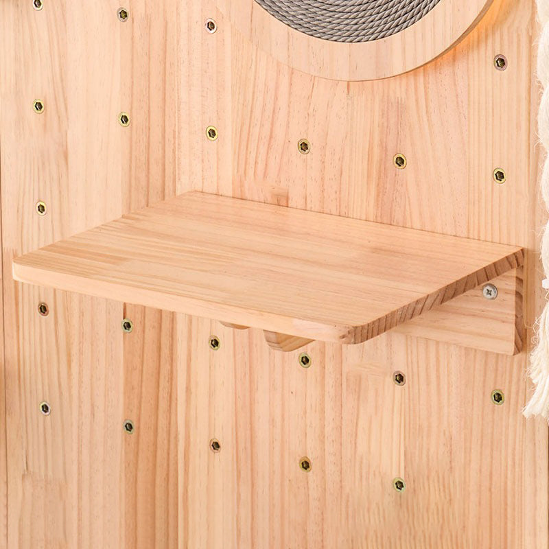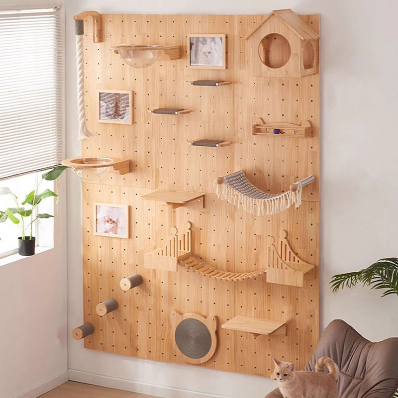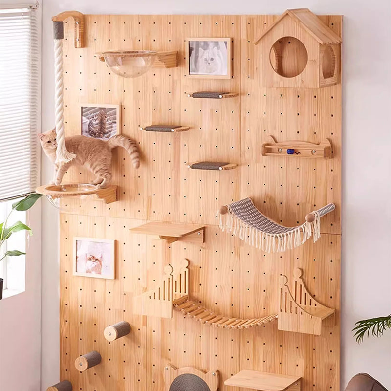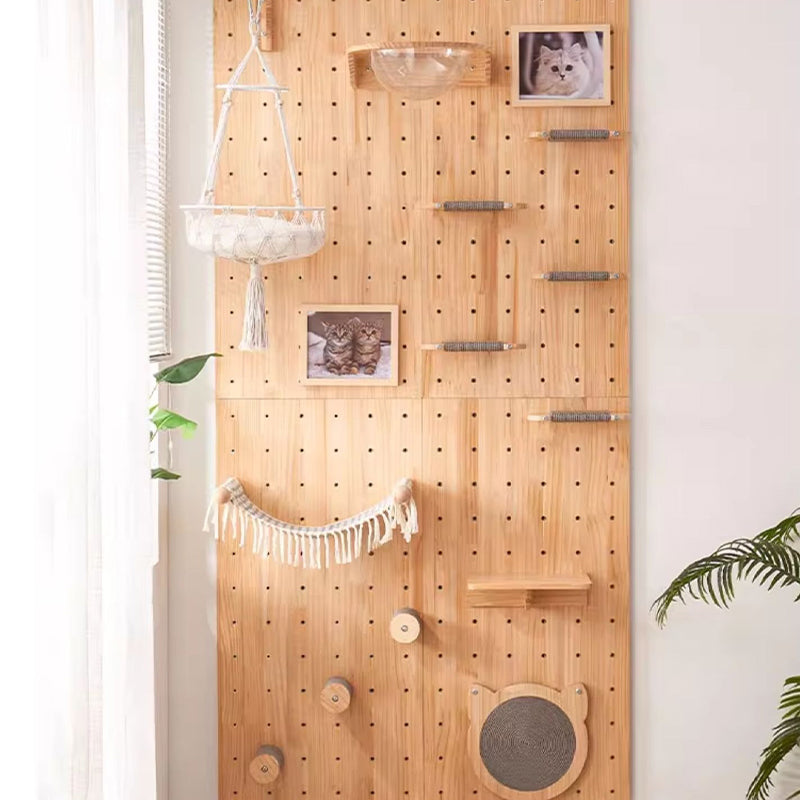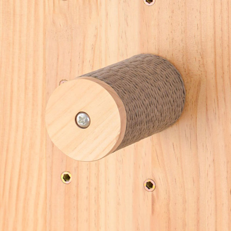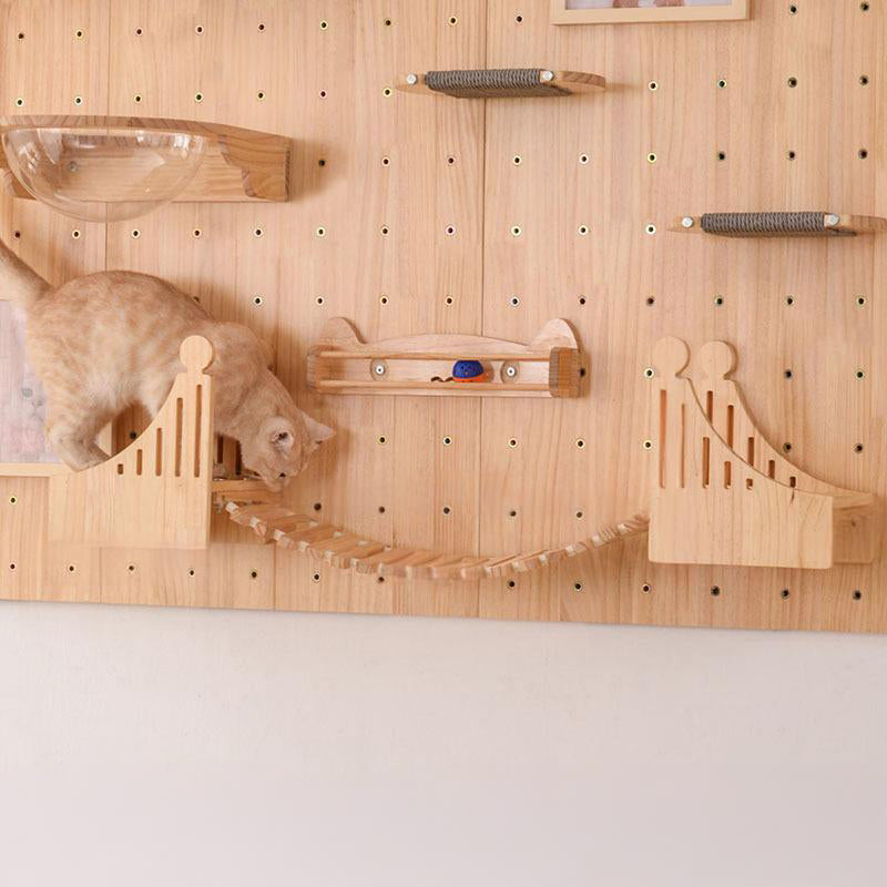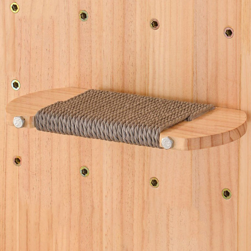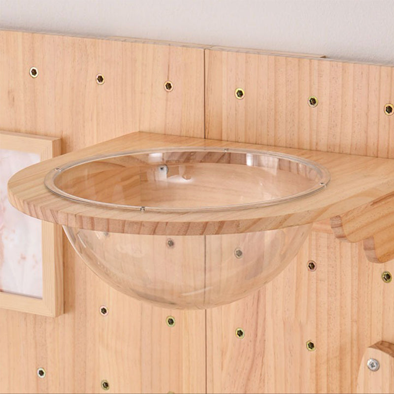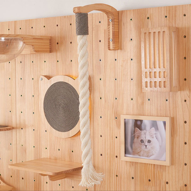 木材をベースに、サイザルロープやクリアボウルを組み合わせた多機能キャットウォール。