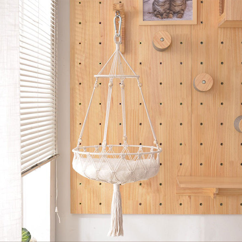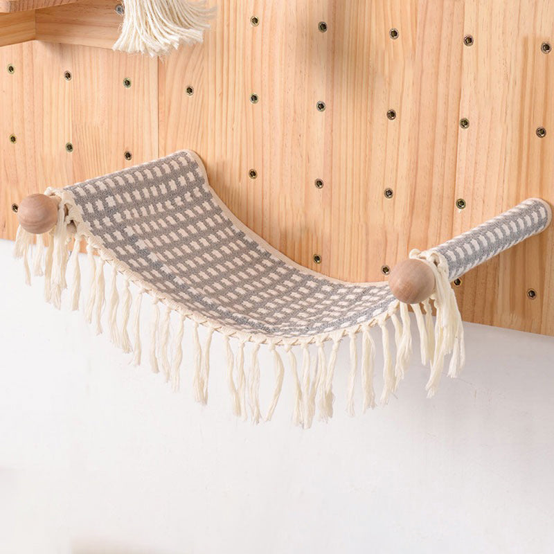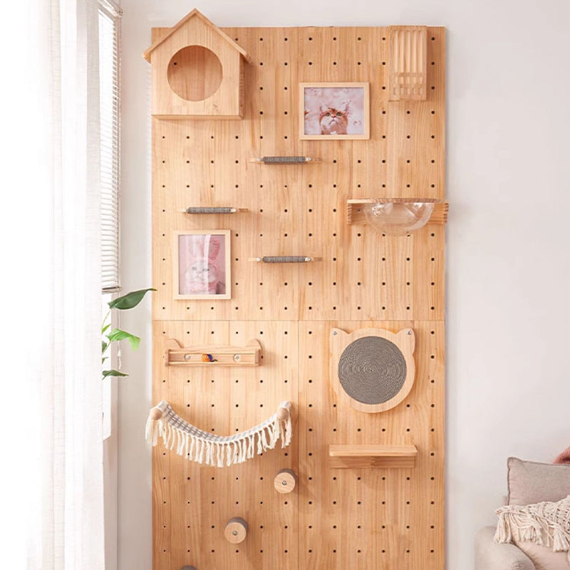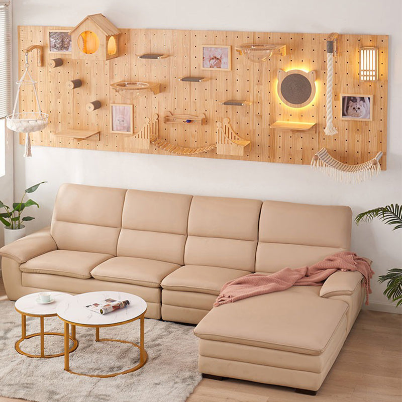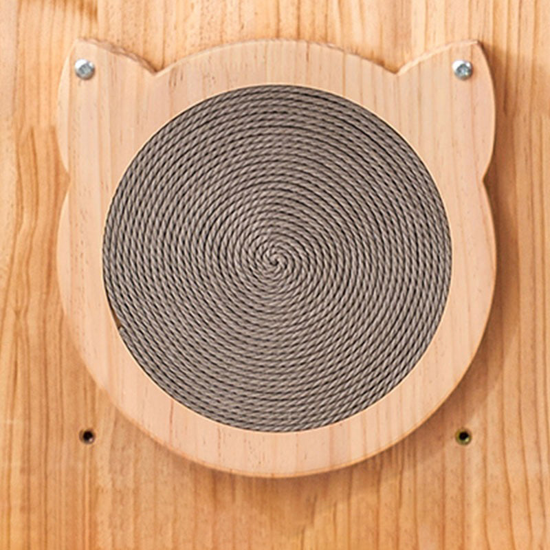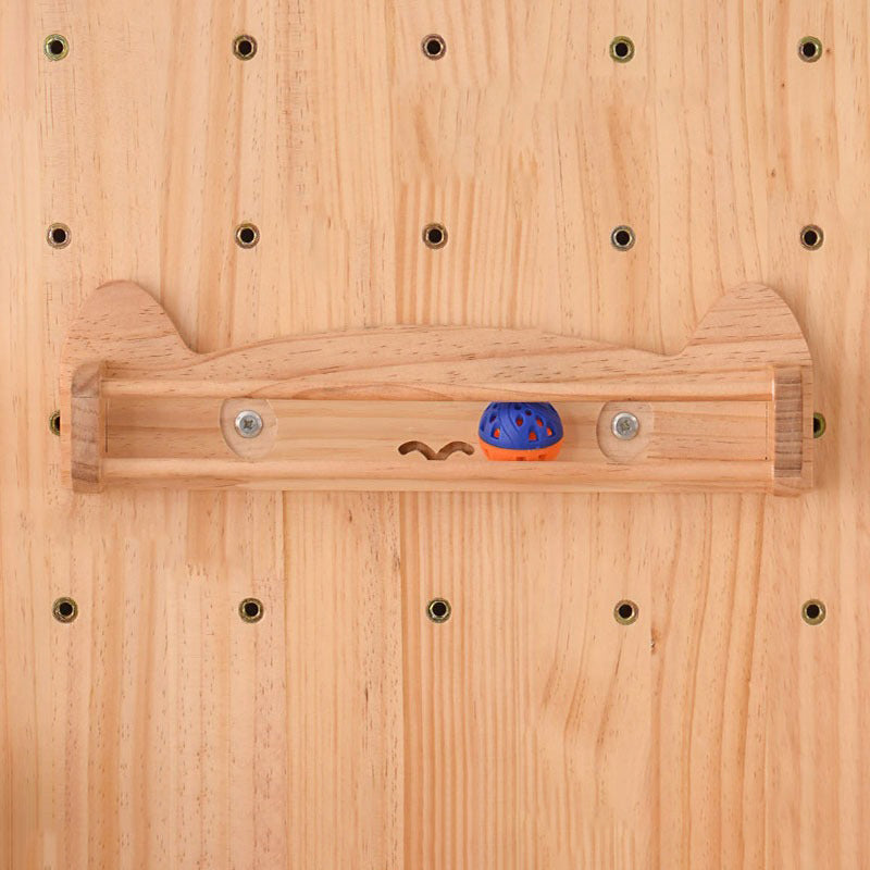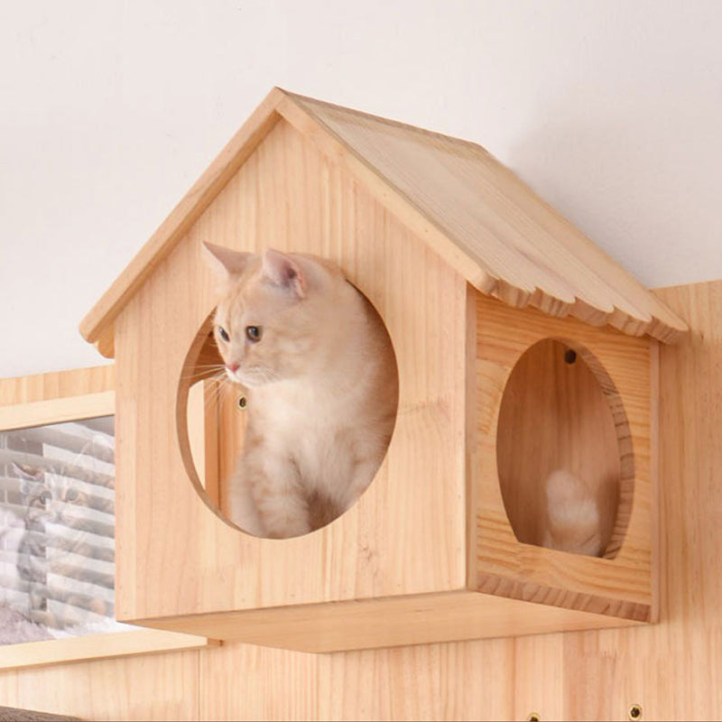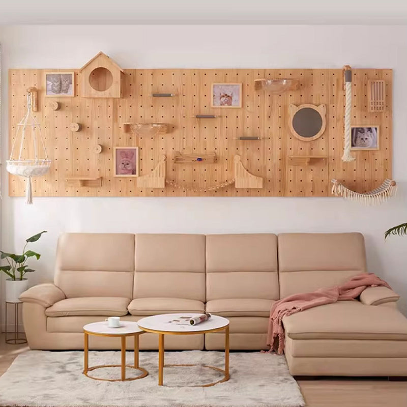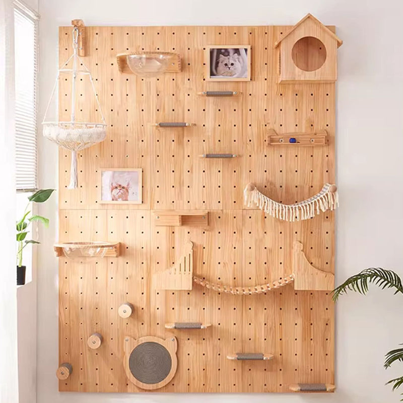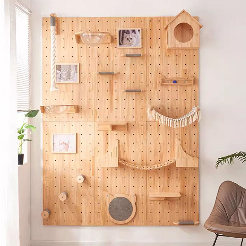 木材をベースに、サイザルロープやクリアボウルを組み合わせた多機能キャットウォール。