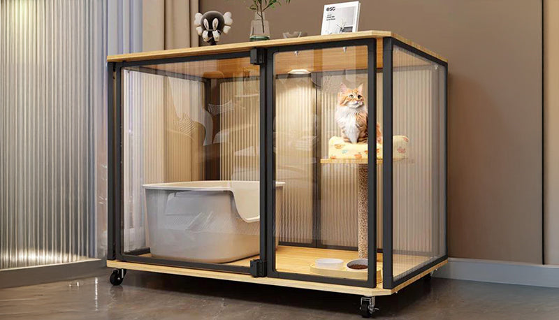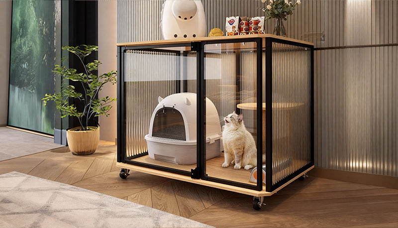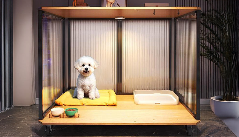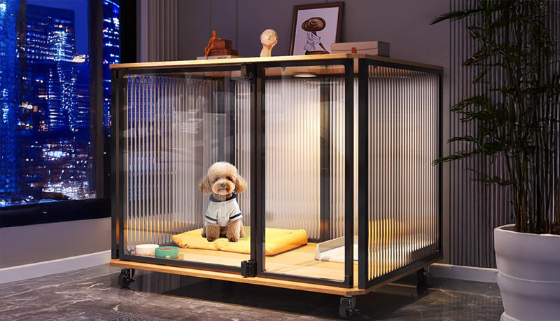 木目とブラックのコントラストがモダンな空間に美しく調和。ペットの生活空間でありながら、インテリアとしても品格を保つ一台です。