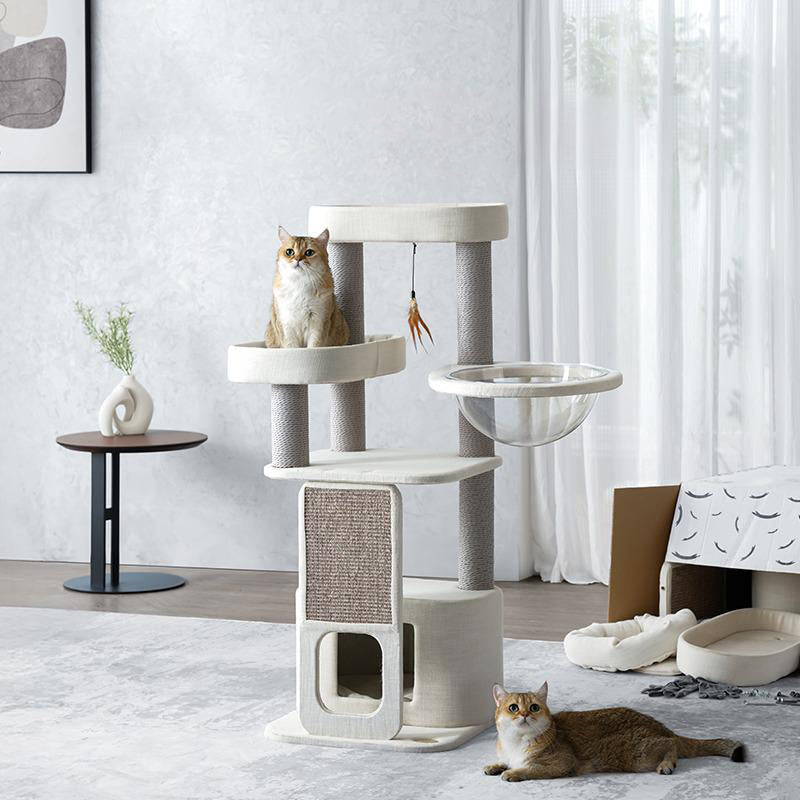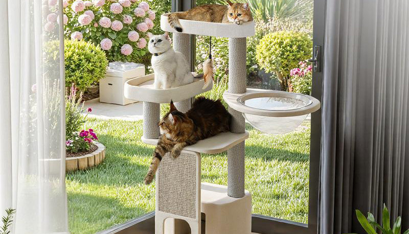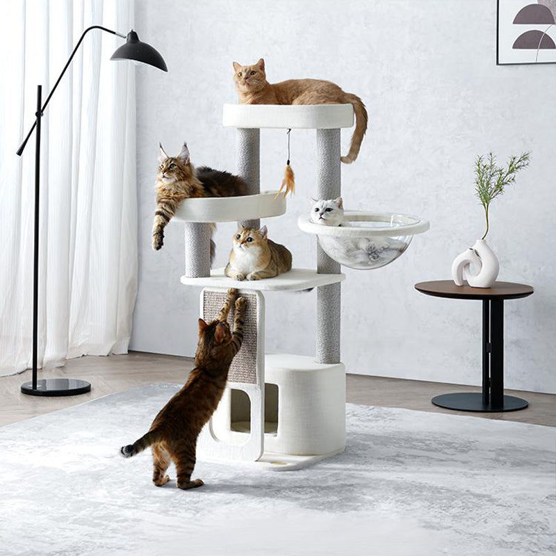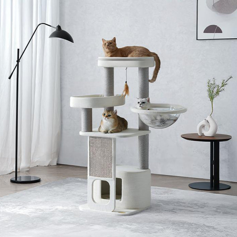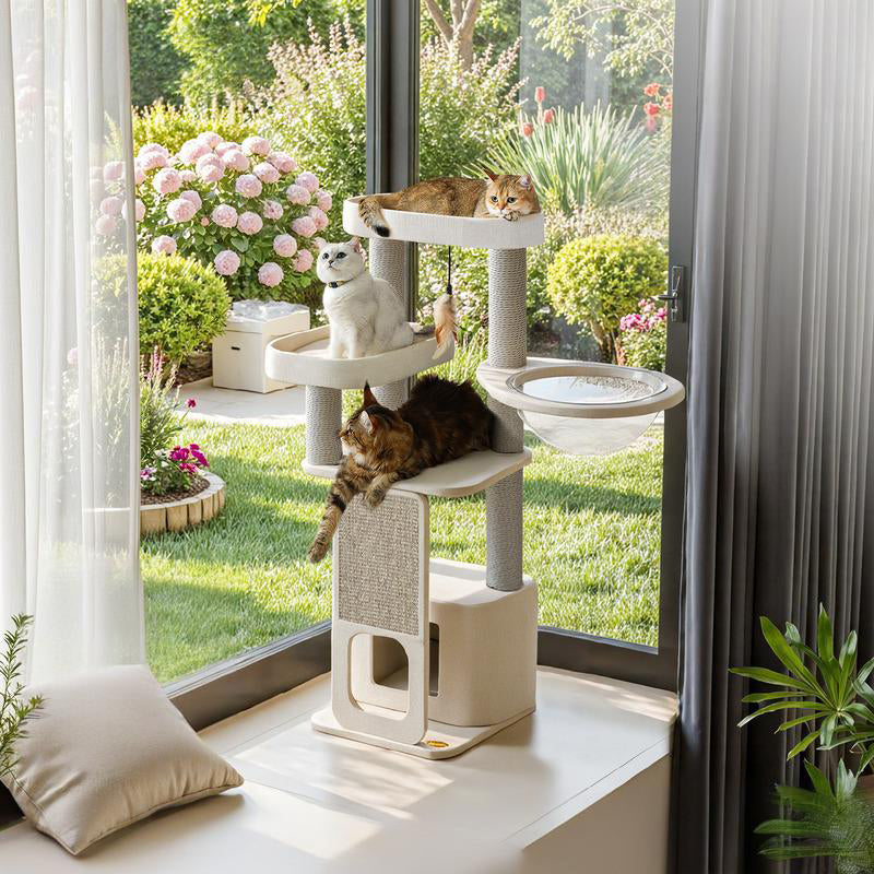 透明ハンモックは猫の好奇心をくすぐり、外の景色を眺めるのにぴったりで、高密度な麻巻き支柱は爪とぎに最適で、ストレス発散にもつながります。
