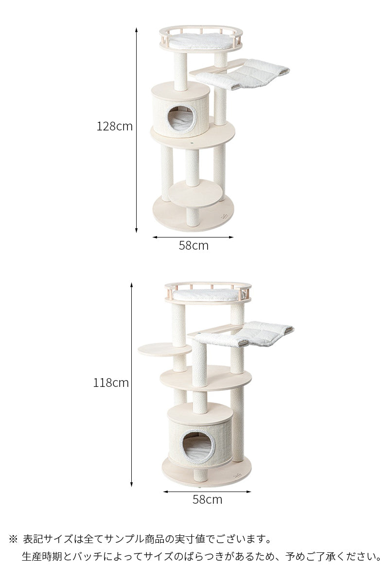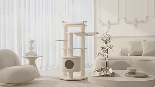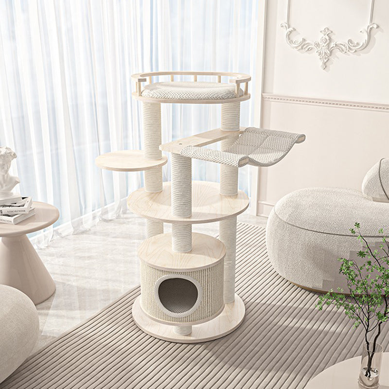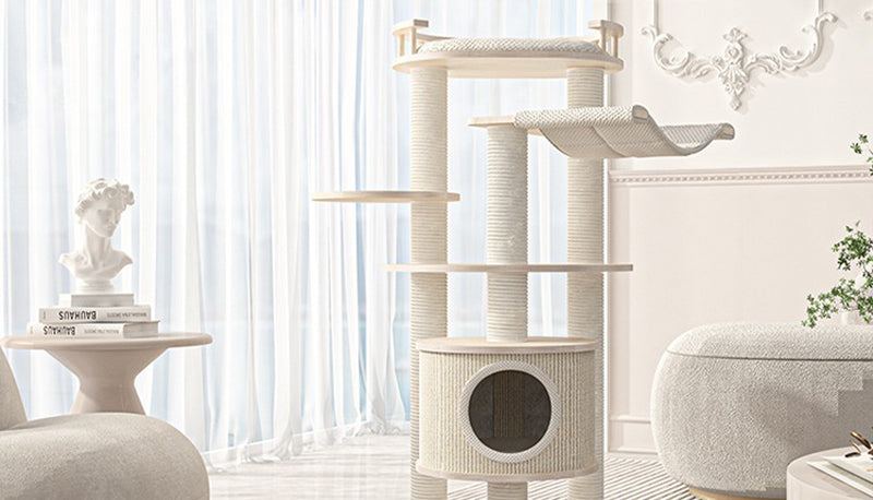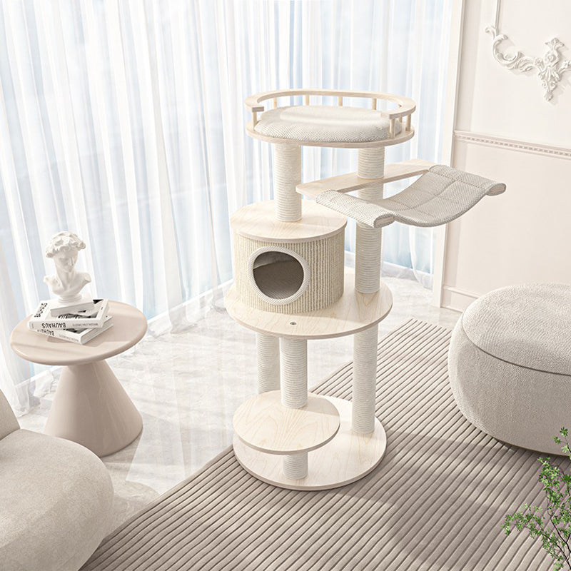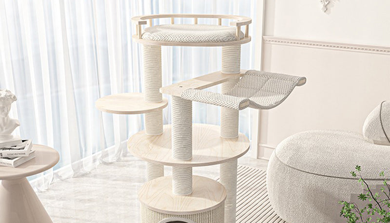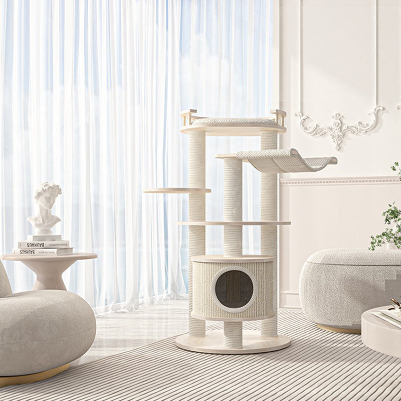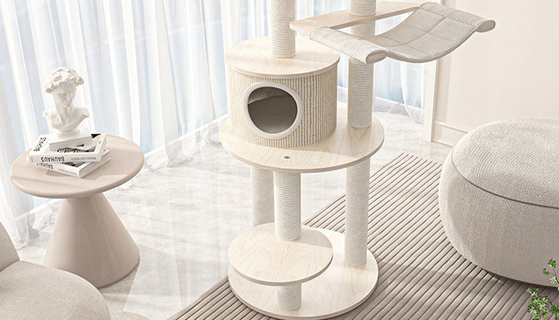 ポールが愛猫の遊びをしっかりと支え、跳ねたり登ったり自由自在。丸窓の隠れ家は「秘密基地」としての楽しみを与え、上段のベッドやハンモックは心ゆくまでくつろげる特等席に。遊びと休憩を行き来できる贅沢な空間が、このタワーひとつで叶います。