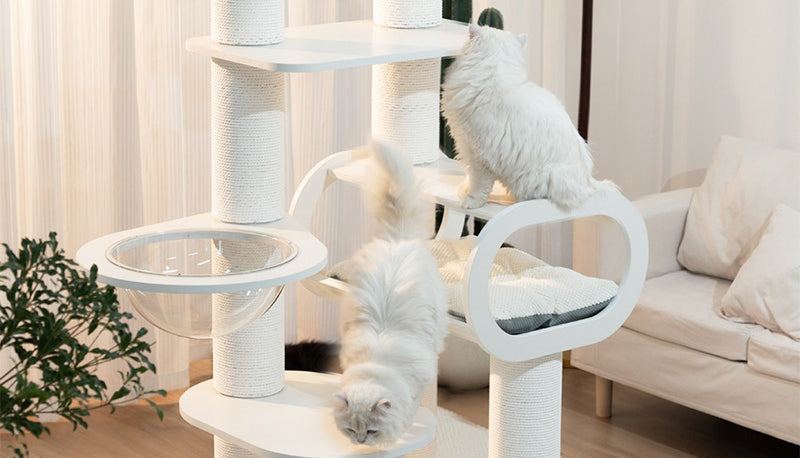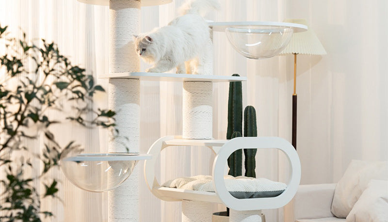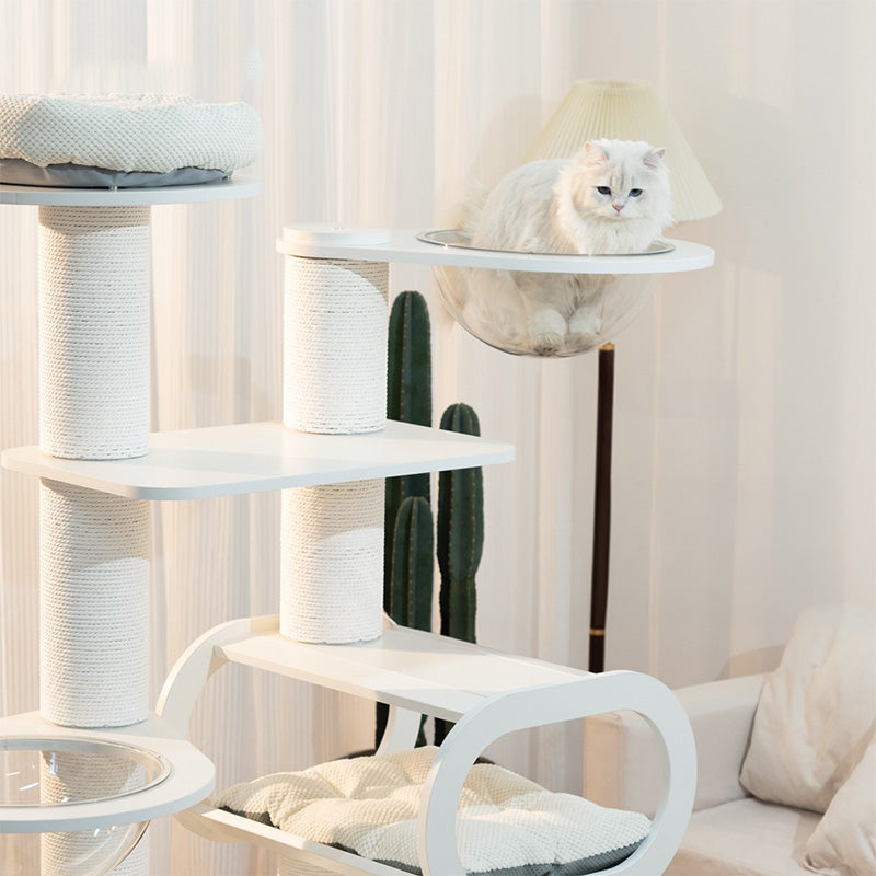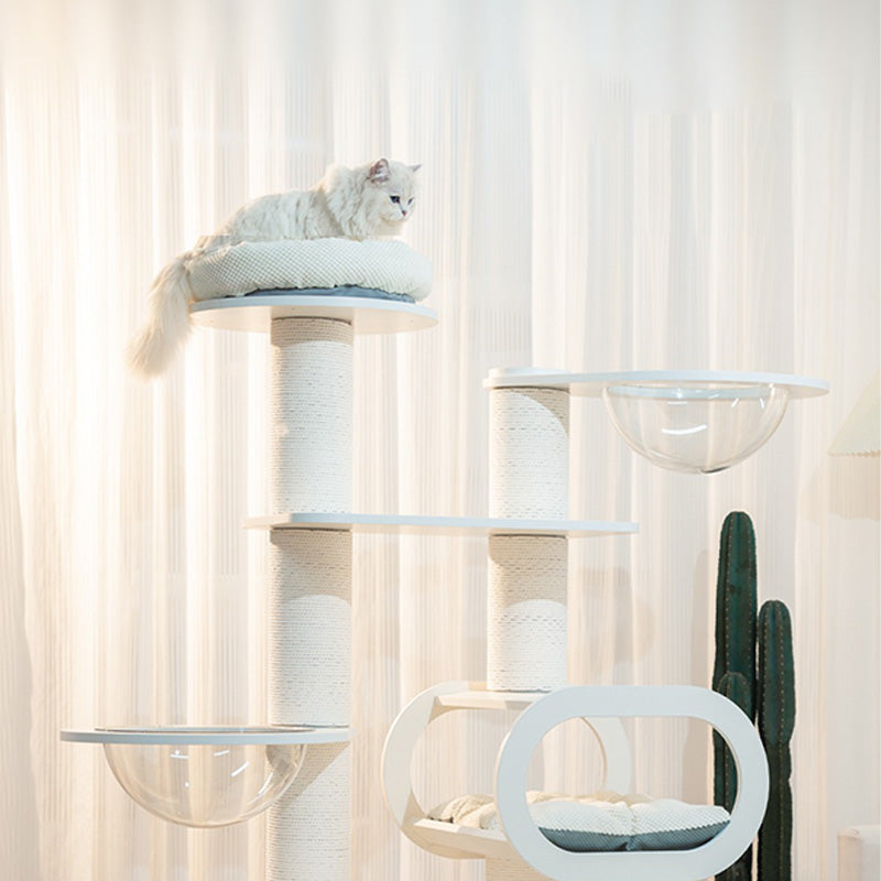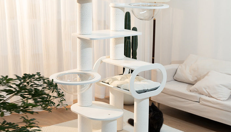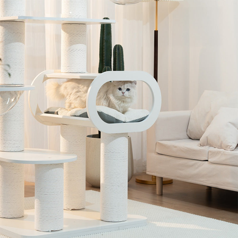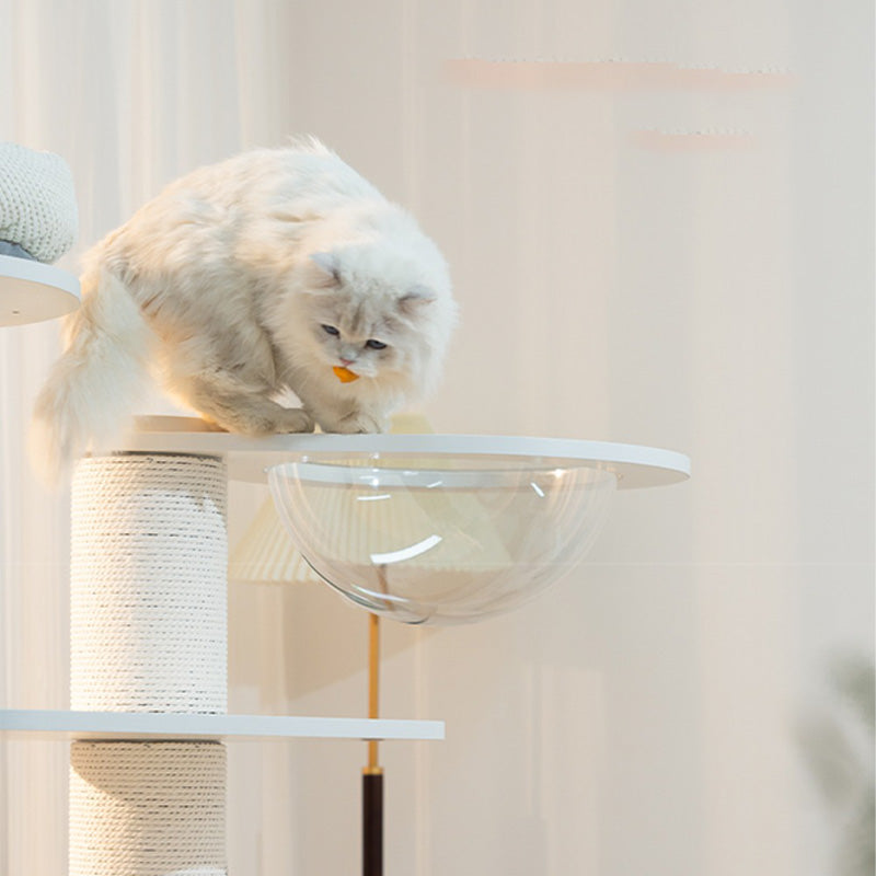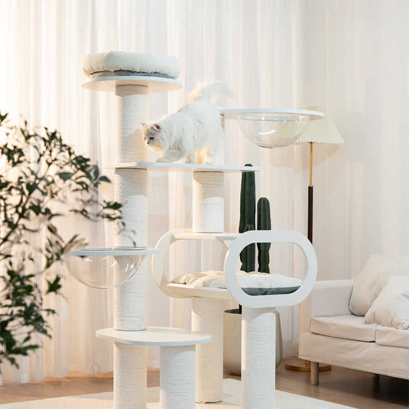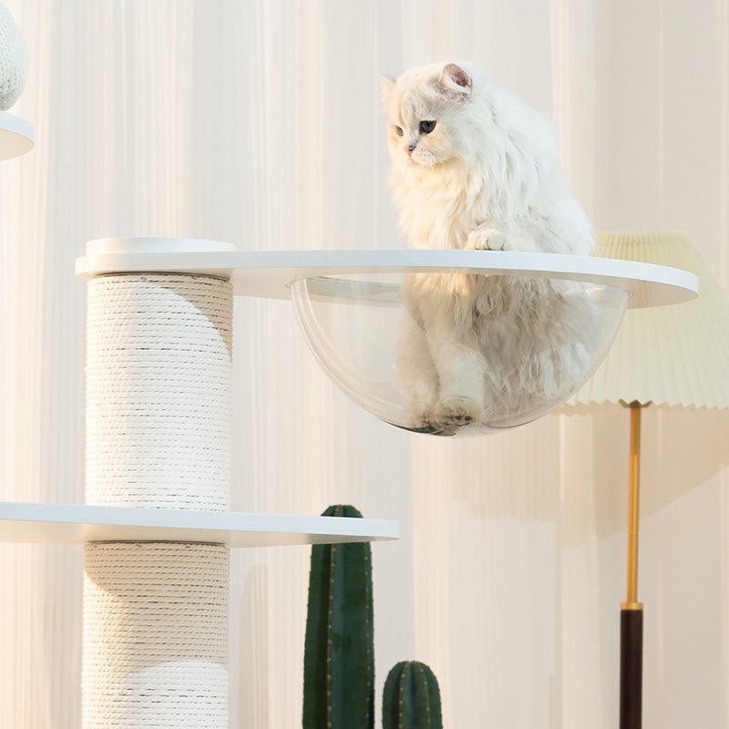 36cmの高透アクリルボウルは、猫が外の景色を眺めながらゆったり休める特等席。ベルベットクッションを備えたハウススペースは、包み込まれるような安心感を与えます。爪とぎポールや複数のプラットフォームが配置されているため、運動不足の解消にも最適です。