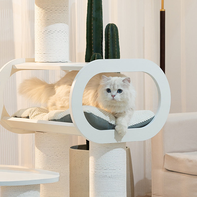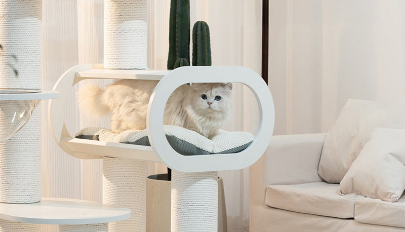 洗練されたホワイトカラーと曲線的なデザインが調和したキャットタワーは、インテリアに自然に溶け込み、まるでオブジェのような存在感を放ちます。プリント合板とベルベット素材の組み合わせは、見た目の美しさだけでなく、猫がくつろぐための快適な質感を実現しました。